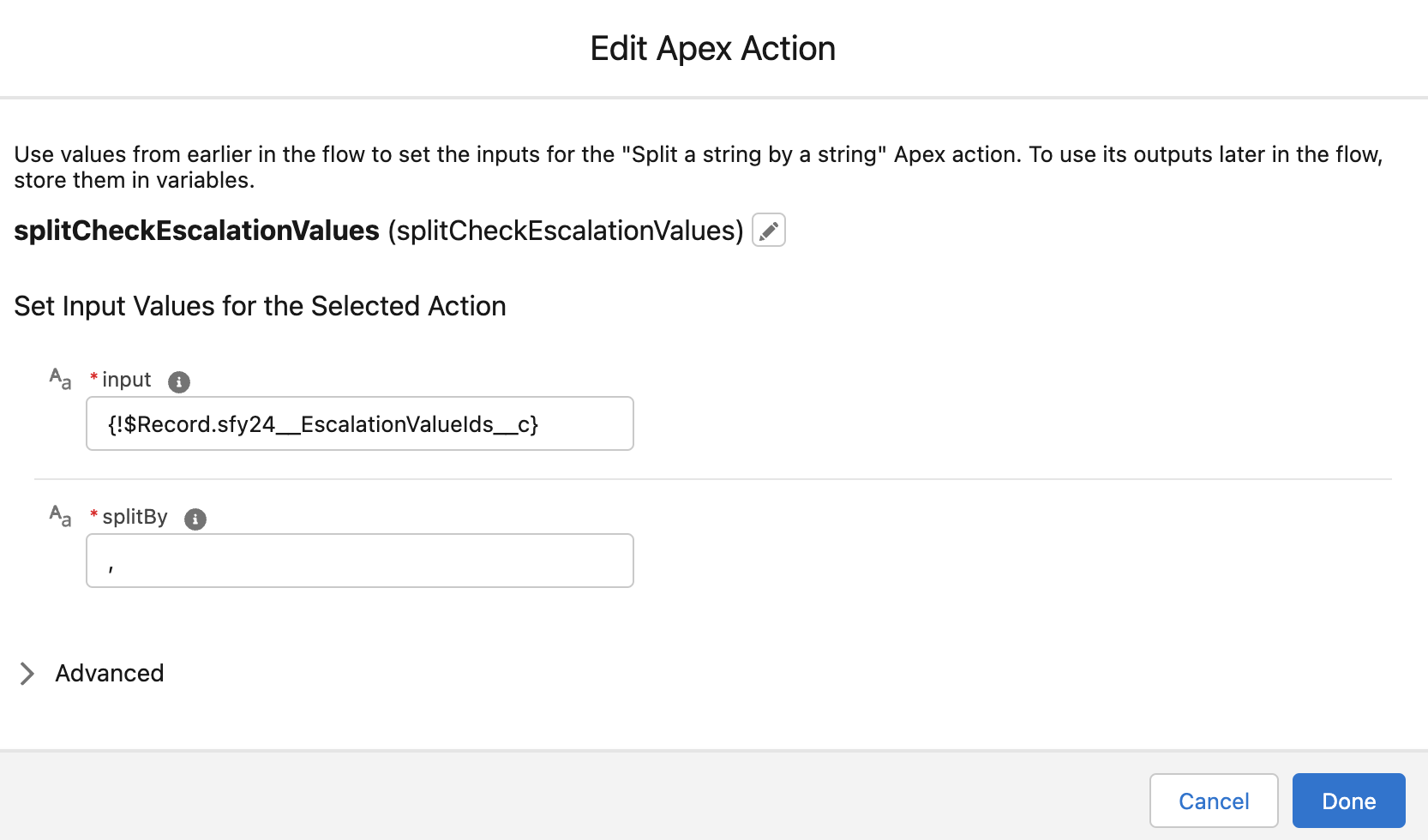 Retrieve all triggered Checklist Escalation Value record ids via Apex Action “Split a string by a string”.