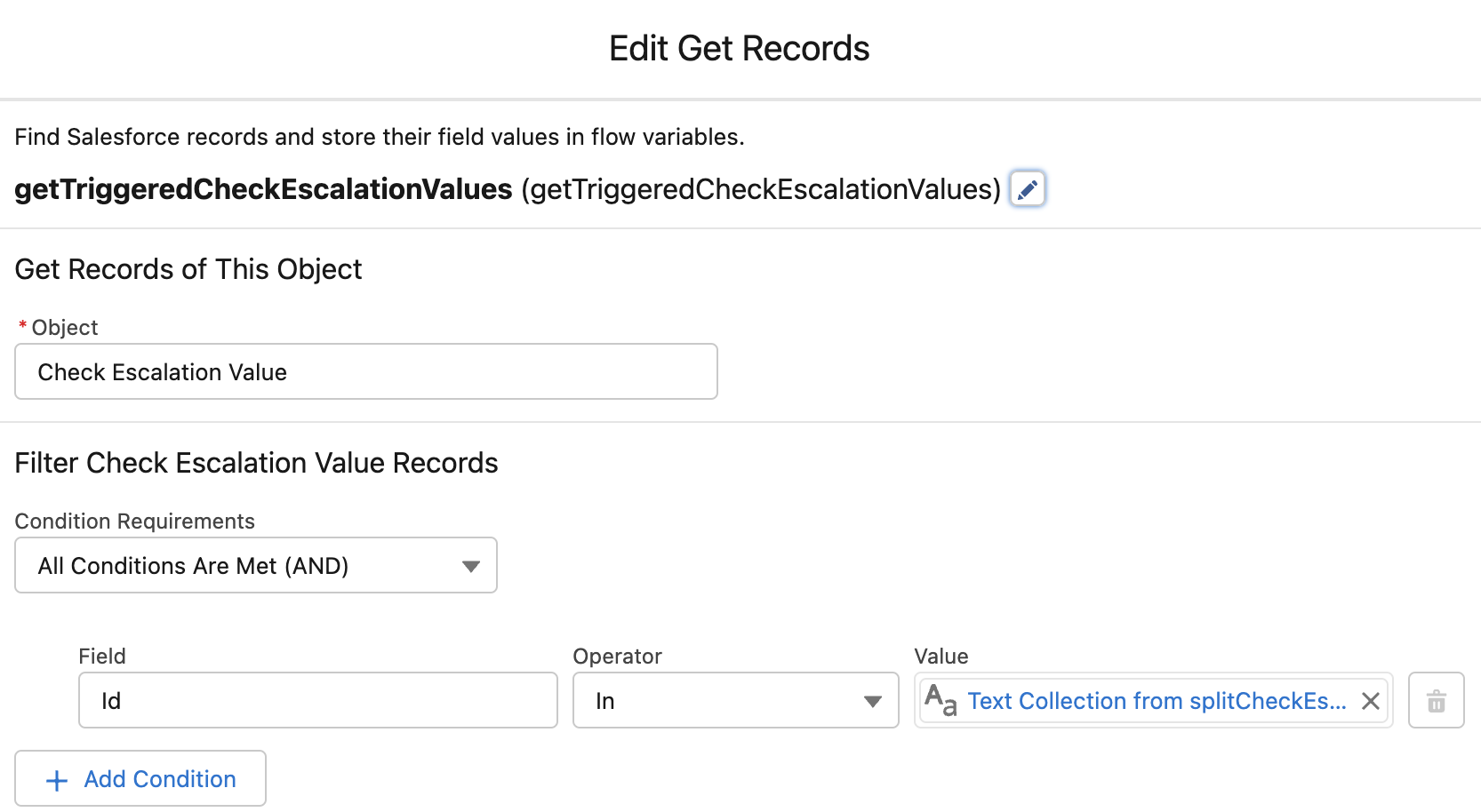 In order to retrieve the corresponding Check Escalation Value records simply add a Get Records element where the record Id is In the Text Collection variable defined in the “Split a string by a string” apex action.