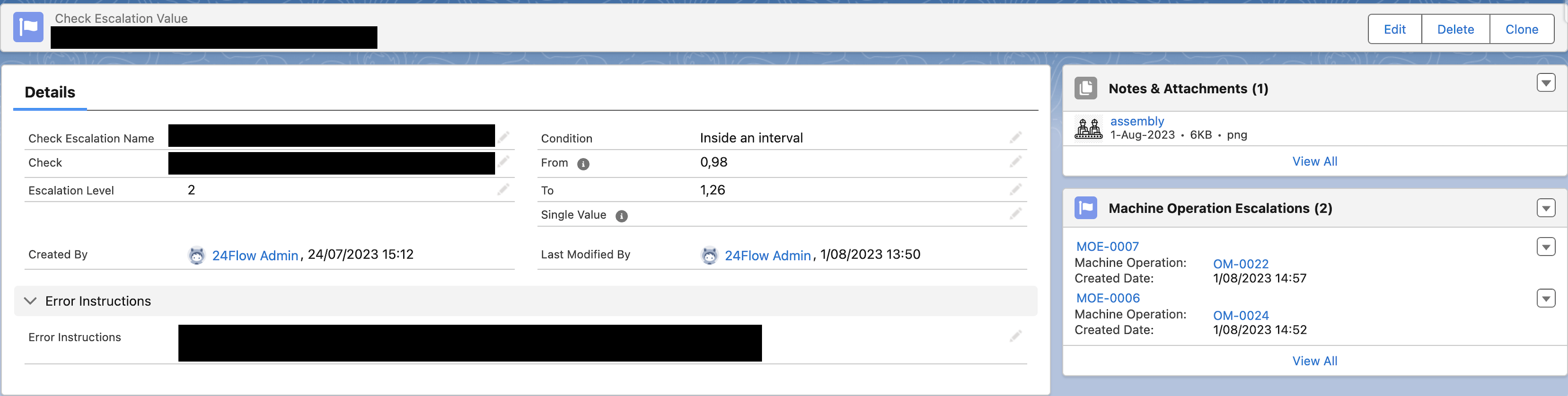 An example of a check with multiple Check Escalation Values. Each Check Escalation Value can, for example, be a certain escalation level. In this use case, each escalation level triggers a certain Flow logic.